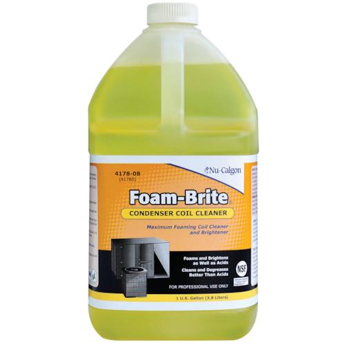 Foam-Brite s foaming power is incredible. It is a non-acidic, alkaline-based cleaner and brightener containing the best available biodegradable ingredients and a unique chelant/surfactant package to quickly penetrate and remove greasy soils and oxidation. Its high foaming formula helps lift greasy soils out of the coil, leaving finned coils clean and bright. It can be used to replace the more dangerous HF acid-based products for condenser coil cleaning because Foam-Brite does not contain any acids.