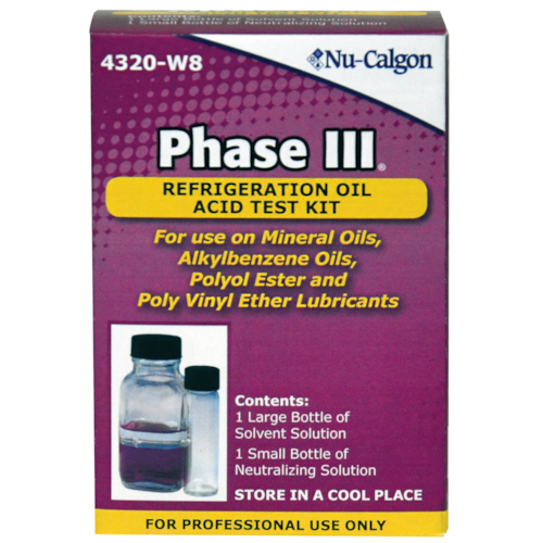 In the Phase III test, an acid number of 0.05 mg KOH per gram of oil has been set as the maximum acceptable acid concentration in mineral oil and alkylbenzene oil. In polyol esters, the number is generally accepted as 0.16 mg. Mineral and alkylbenzene oils with an acid number less than 0.05 mg or POE s with an acid number less than 0.16 mg are acceptable and will cause no change in the color of the test kit s acid indicator. However, if the respective oils have an acid number greater than these limits, it will cause the acid indicator to change from purple to pink or clear indicating that the oil is contaminated.